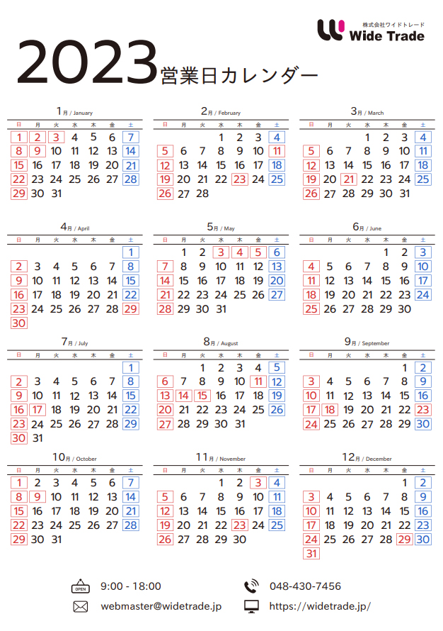 年末年始休業のお知らせ・2023年度営業カレンダー株式会社ワイドトレード。
