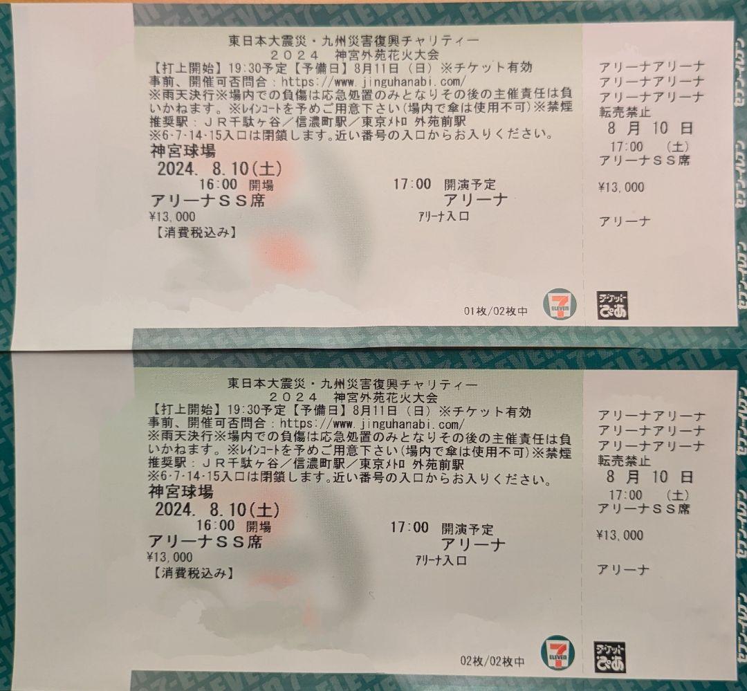 神宮外苑花火大会 2024 アリーナSS席 2連番 紙チケット - メルカリ。