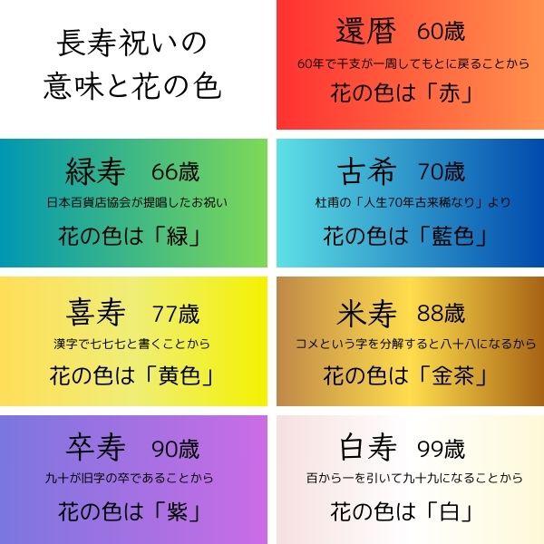 長寿祝いの色 一覧 還暦・古希・喜寿・傘寿・米寿・卒寿・白寿よくある質問おしゃれな神戸のお花屋さんグラウンドのコラム。