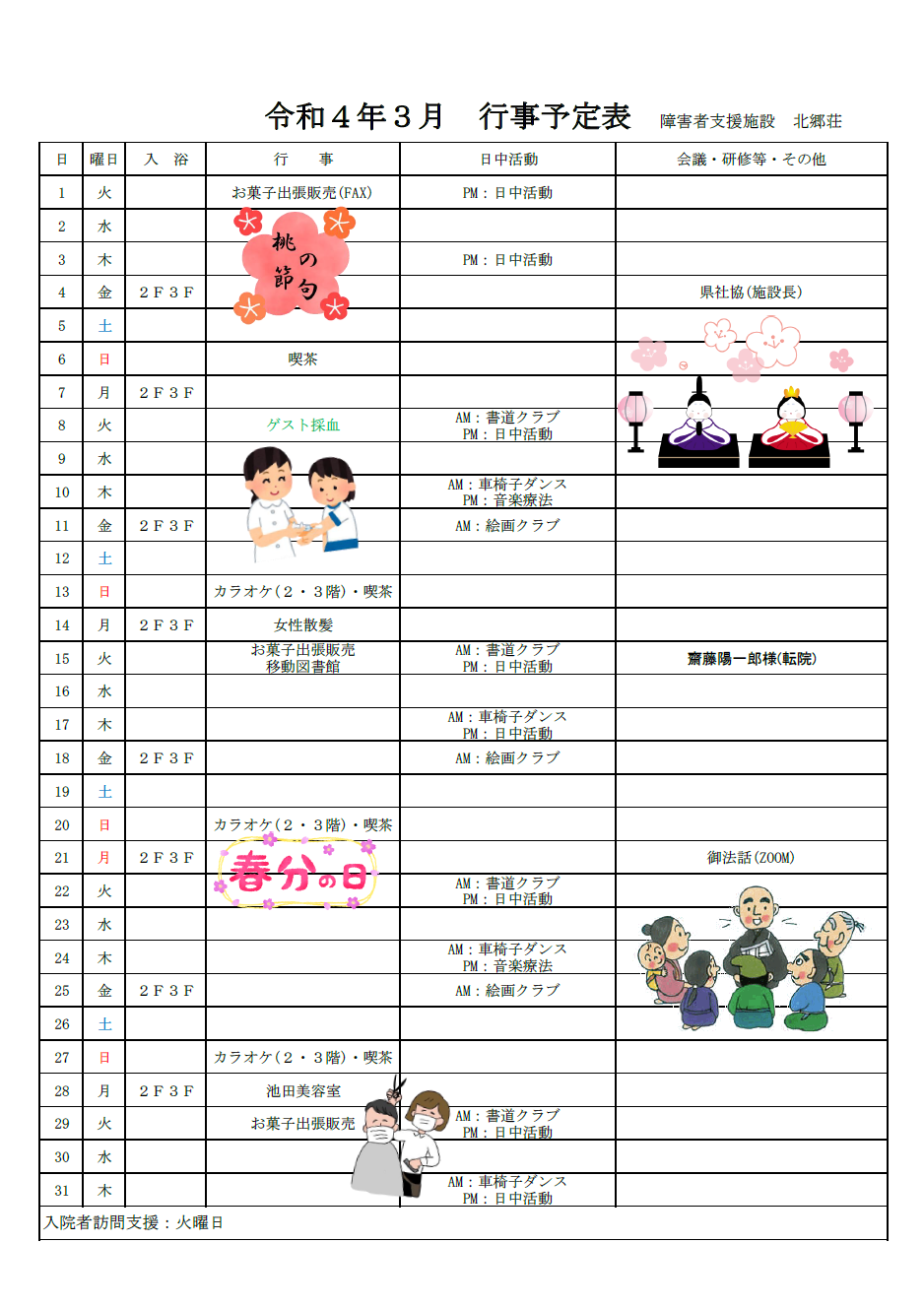 デイサービス 3月行事予定のお知らせお知らせすずかけの郷社会福祉法人 昴。