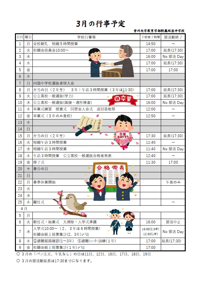 3月月中行事予定表 H29- 尼崎市立大成中学校。