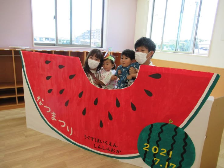 記念にハイチーズ🍧📷✨保育園のお祭りに、 『フォトスポットコーナー』🌈が やってきました✨ かき氷や花火に顔をはめたり、背景にして写真を撮ってお祭り気分を味わいながら 思い出を残せるコーナーです♪ おうちの人、先生と、お友だちとお祭りで撮った写真を見。