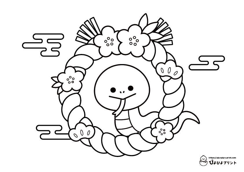 正月飾りとヘビ 巳年正月ぬりえぴよぴよプリント。