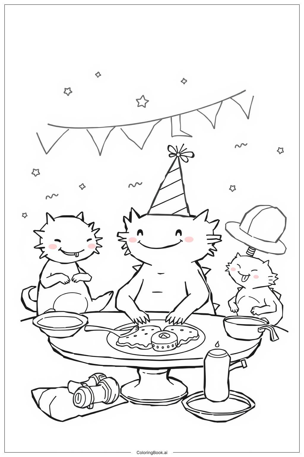 アホロートルの楽しいお正月のごちそう 塗り絵ページ 無料のPDF&PNGプリント。