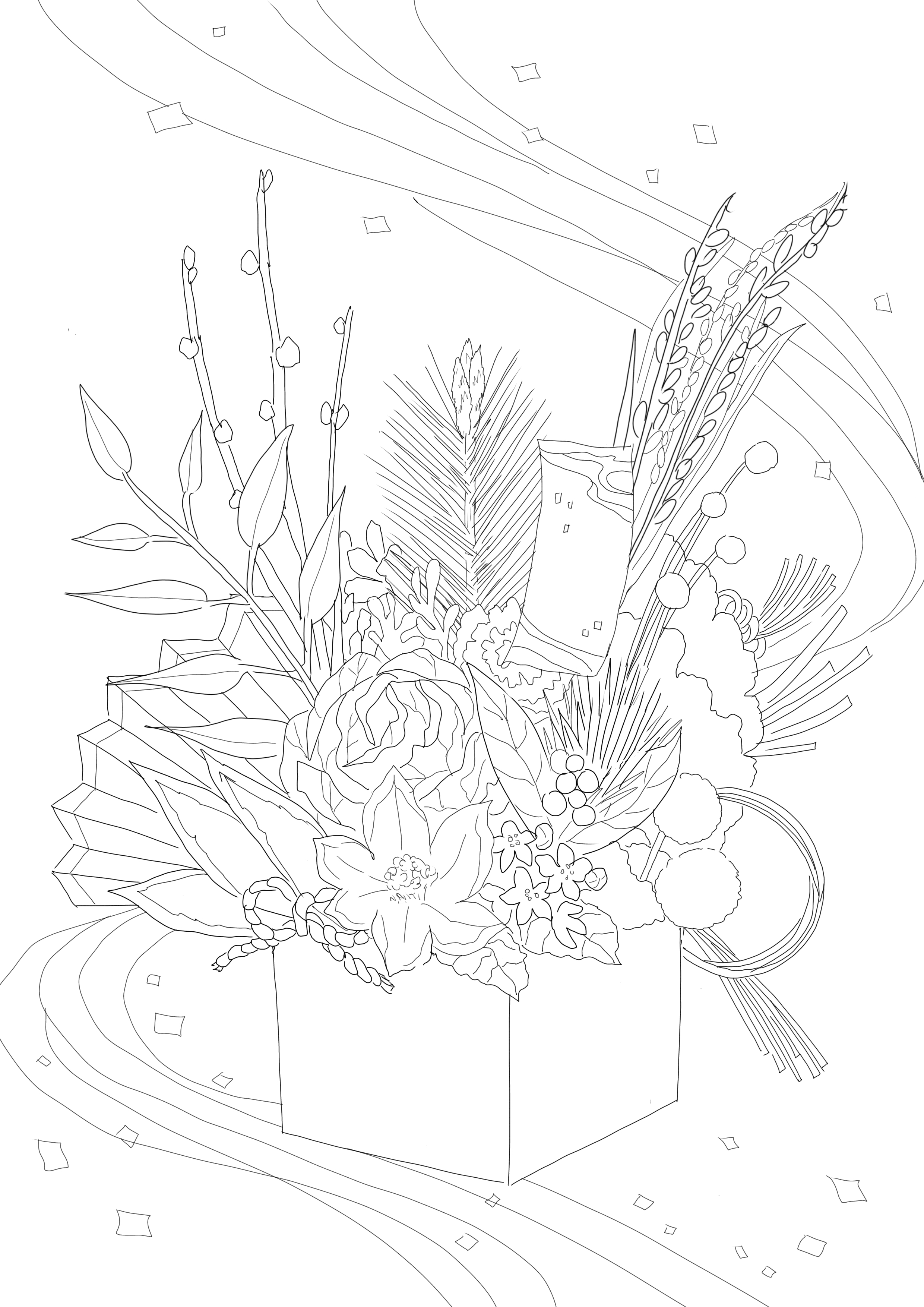 お正月にぴったりの、和風のフラワーアレンジメントの塗り絵です。メッセージも書きこめます。 ぬりえラボ。