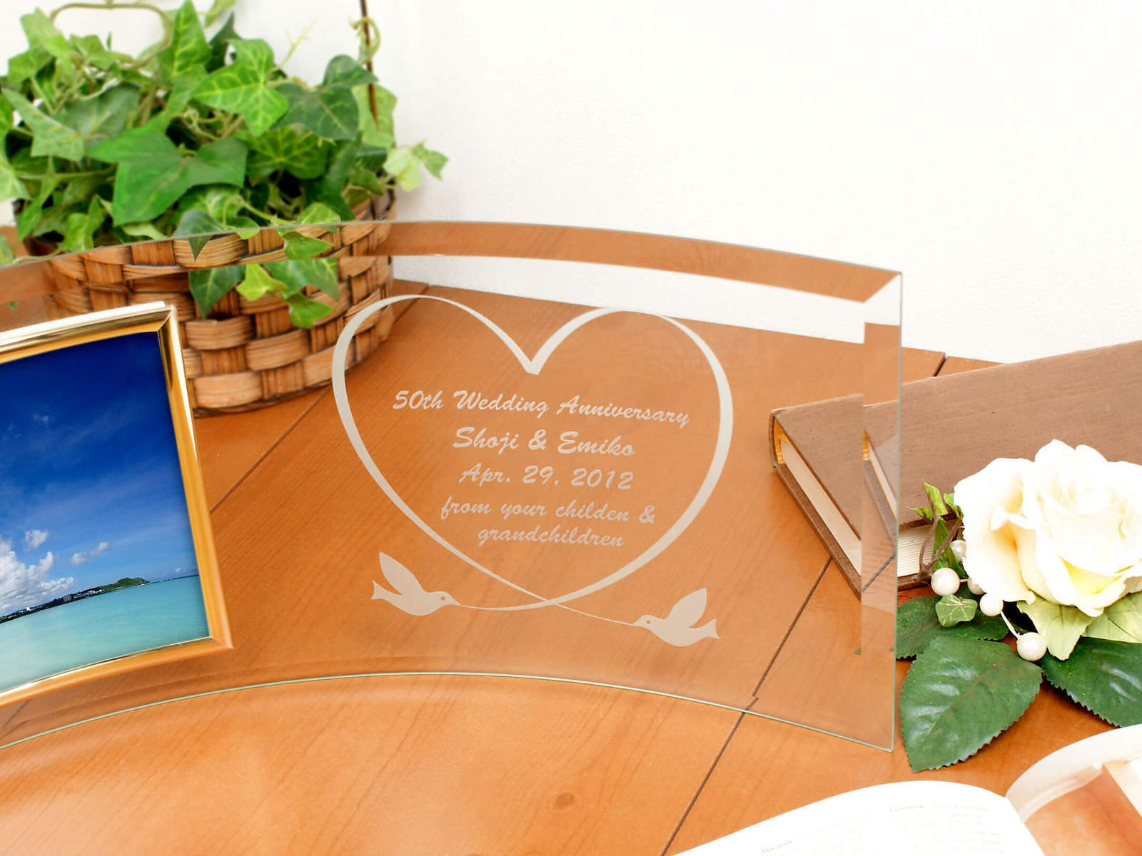 楽天市場 金婚式 写真立て 名入れ メッセージ 結婚50周年 結婚記念日 お祝い 贈り物 ギフト 記念品 メッセージ入り 長寿祝い 敬老の日両親プレゼント 名入れ無料 メッセージ プレゼント 金婚式・結婚記念日50周年の贈り物「ガラスフォトフレームプレート」 : 結婚式。