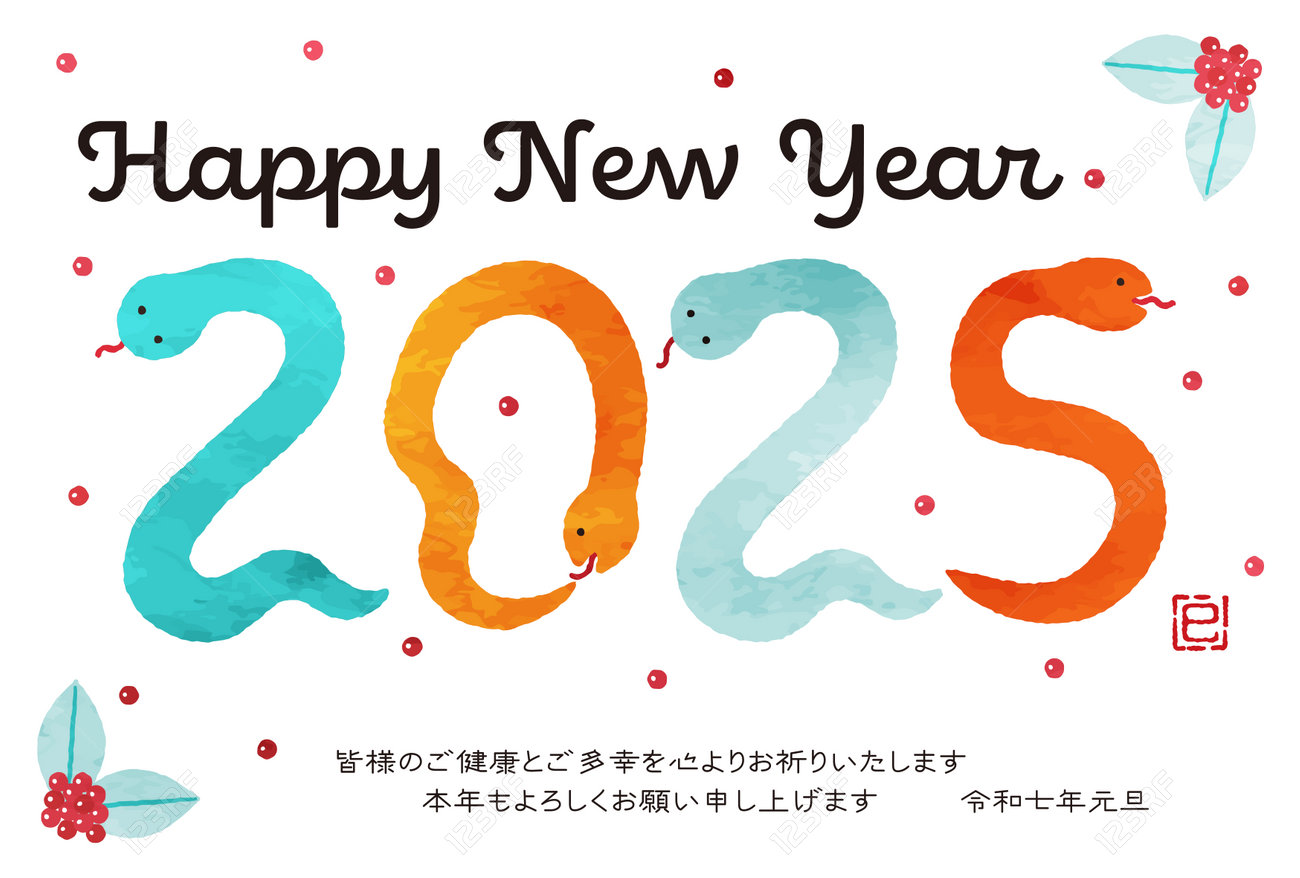 HappyNewYear 2025年年賀状 手書き風筆文字 蛇が2025の形を体現 水引きのイラスト素材273324801- イメージマート。