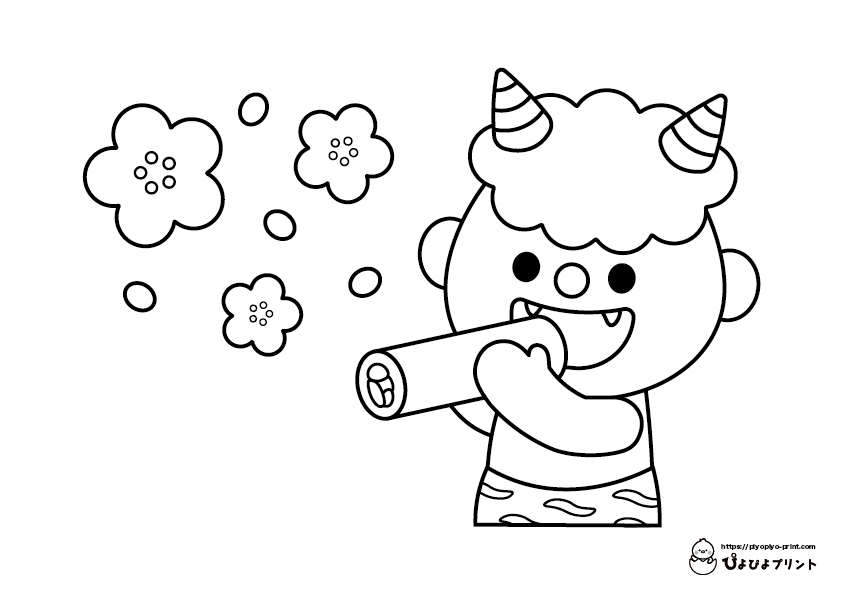 節分ぬりえ 恵方巻きをたべる鬼ぴよぴよプリント。