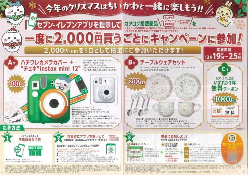 ちいかわクリスマスケーキ2025 ハチワレ君チェキ風カメラカバーが当たる!セブンアプリ会員限定クリスマスキャンペーン2025完全ガイドそのほか食器セットなどや無料コーヒー券なども!小顔&骨盤矯正サロンkinoe。
