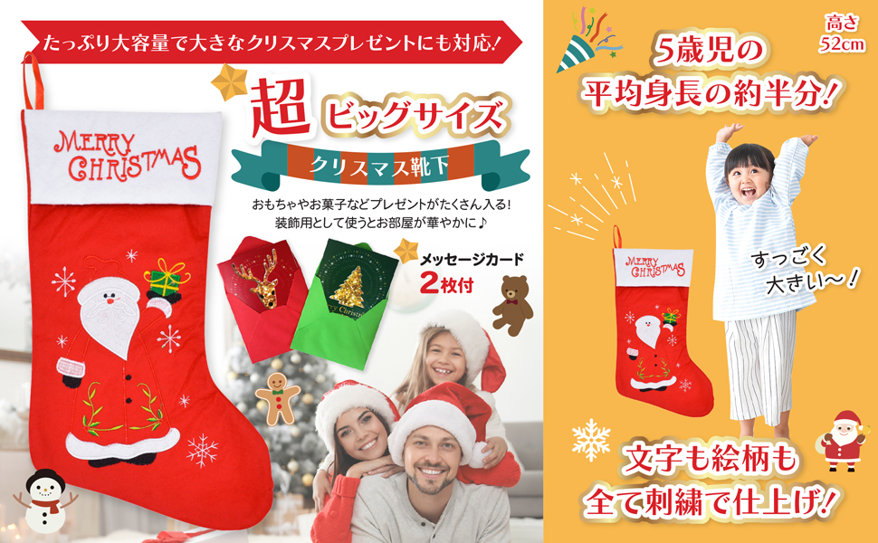 AmazonRinoyLOHA クリスマス 靴下 特大 プレゼント用 52cm メッセージカード付き ギフトバッグ 飾り サンタクロースクリスマス雑貨おもちゃ。