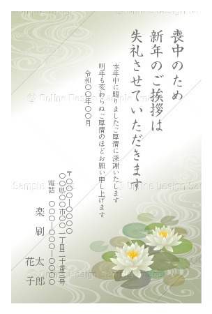 睡蓮のデザインのカラー喪中ハガキテンプレートプリントできる年賀状デザイン素材。