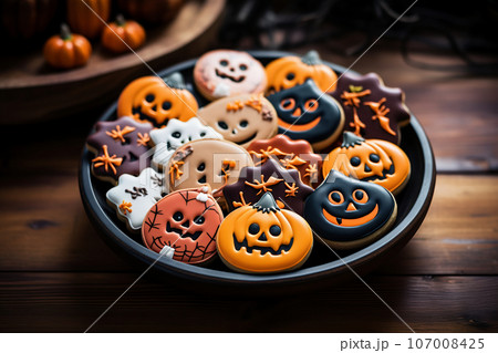 皿に盛りつけたハロウィンのアイシングクッキーのイラスト素材107008425- PIXTA。