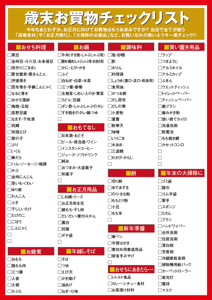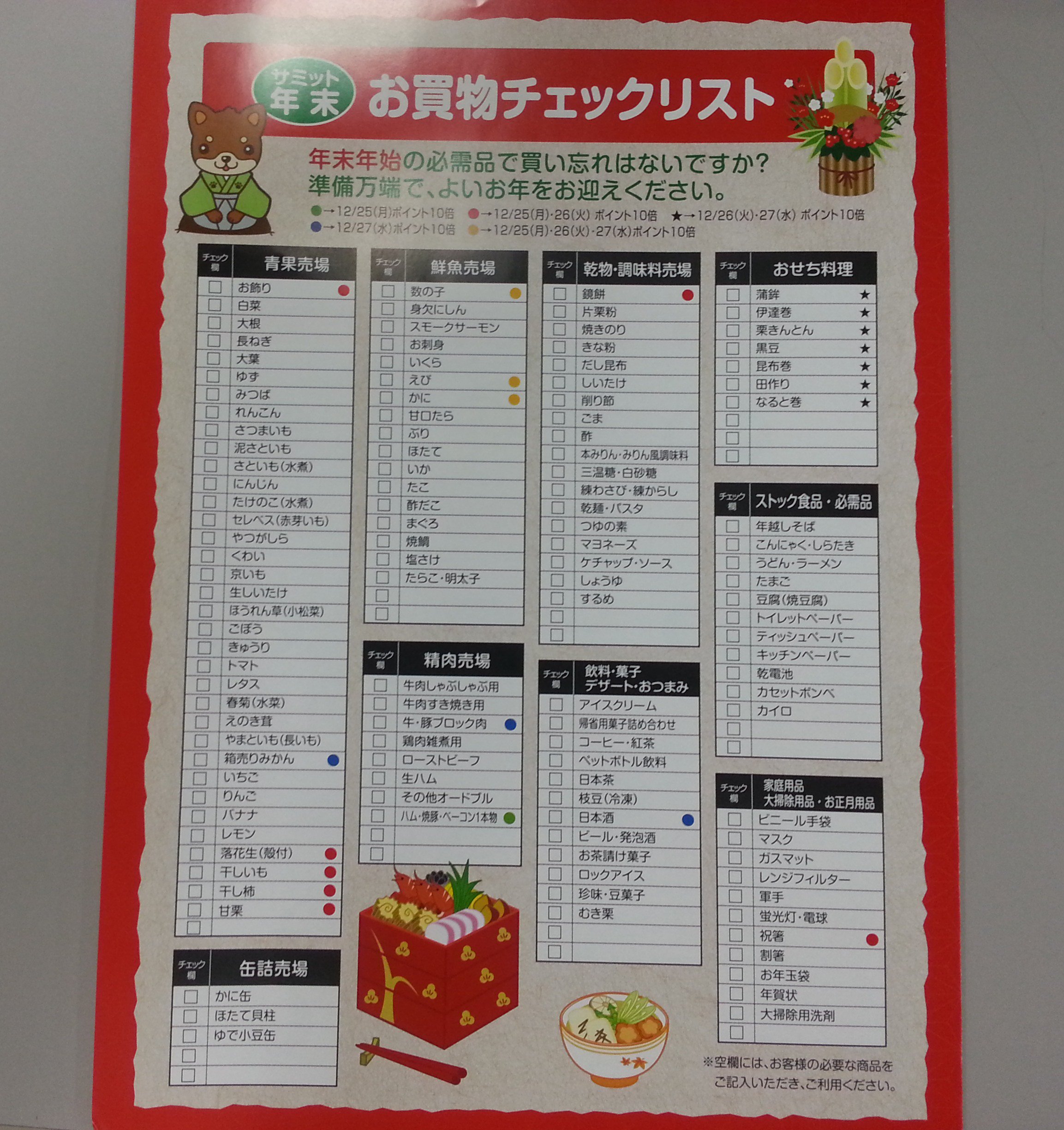 サミットストア公式 on X: " サミット年末お買物チェックリスト 配布中!!! 年末年始の必需品のチェックリストを作りました!!ぜひ、年末年始の準備に活用して下さいね *^_^* 店舗にて配布中。https:t.co Xjyvi252Fx"X。