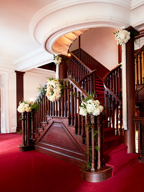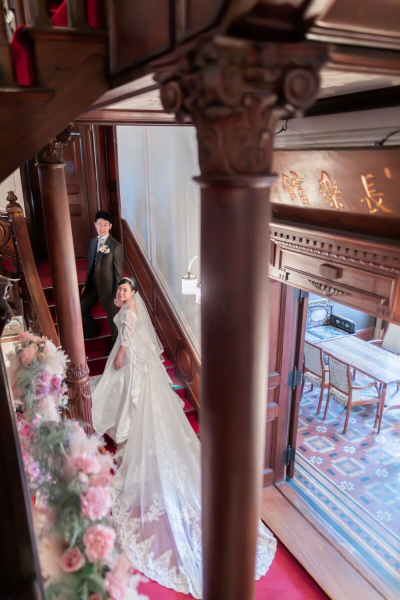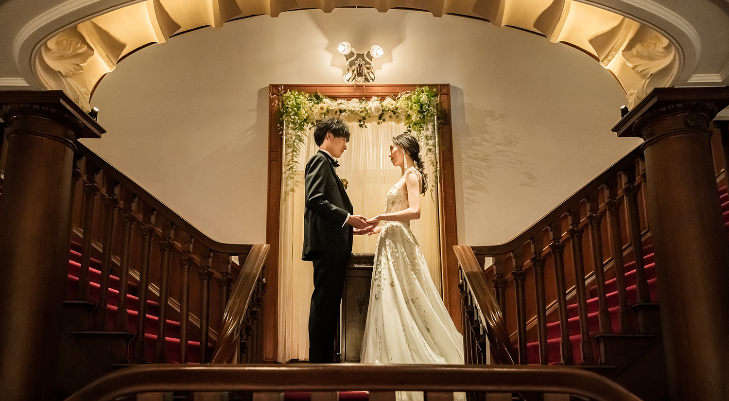 長楽館ならではの「フロア挙式」 明治時代から受け継がれてきた趣ある階段が おふたりの特別な一日を美しく彩ります長楽館ウエディング長楽館長楽館ウェディング大人ウェディング洋館明治時代国指定重要文化財結婚式京都婚結婚式場祝言和婚関西。