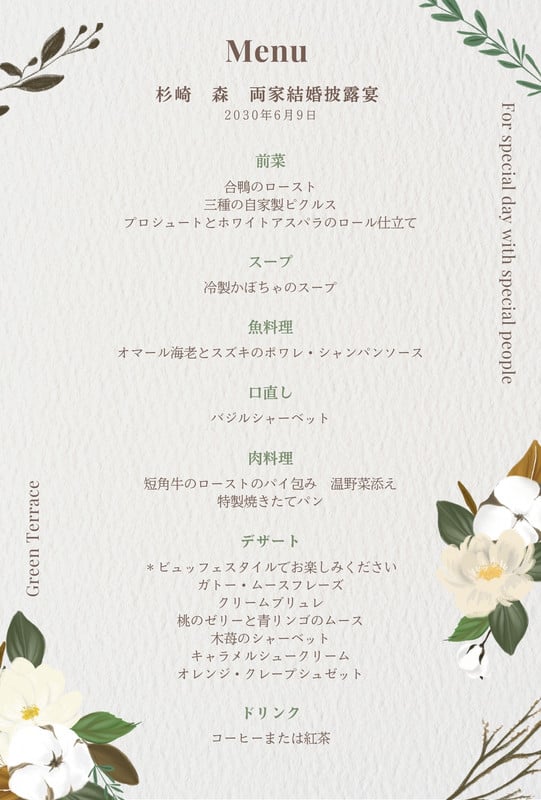 ウェディングメニューテンプレートでおしゃれな結婚式や披露宴のメニュー表デザインを無料で作成!Canva。