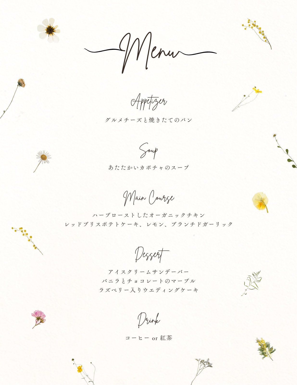 2ページ - ウェディングメニューテンプレートでおしゃれな結婚式や披露宴のメニュー表デザインを無料で作成!Canva。
