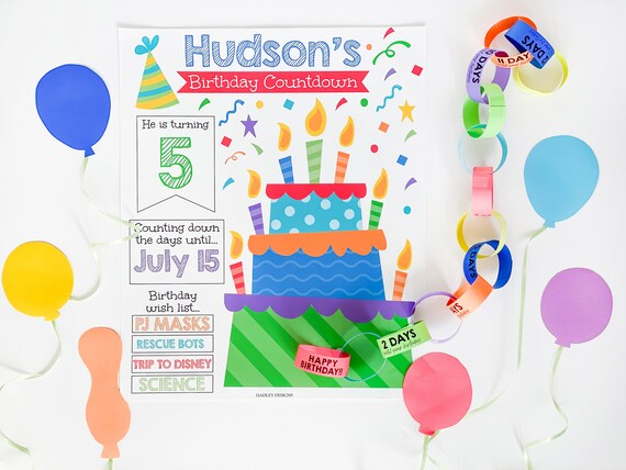 誕生日カウントダウンサインと紙のチェーンの印刷物、子供用ハッピーバースデーデコレーションキットテンプレート、誕生日までの日数、ケーキカレンダーポスターPDF- Etsy 日本。