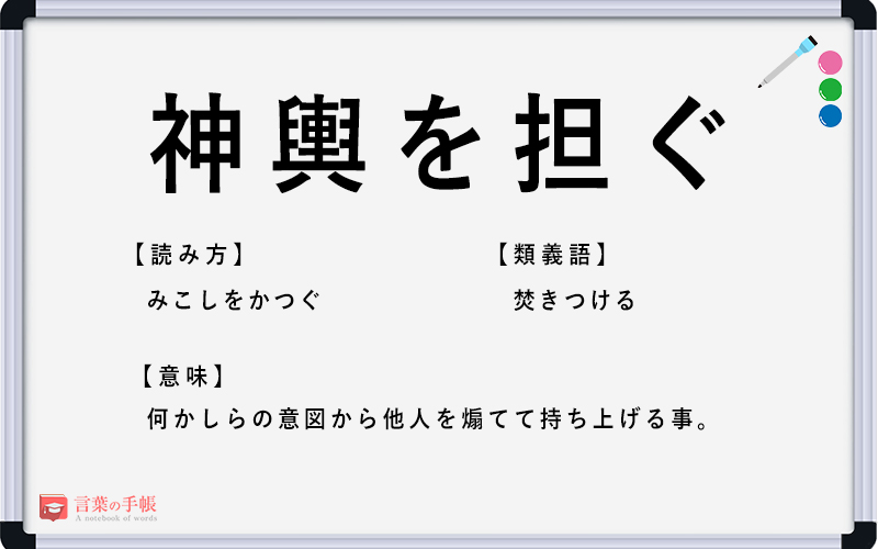 神輿を担ぐ」の使い方や意味、例文や類義語を徹底解説!「言葉の手帳」様々なジャンルの言葉や用語の意味や使い方、類義語や例文まで徹底解説します。