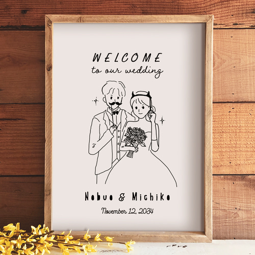 楽天市場 ウェルカムボード ウェルカムスペース 受付 ウェルカムスペース装飾 飾り付け 結婚式 線画 線画イラスト イラスト フレーム入りホワイトフレーム 名入れ 和風 線画ウェルカムボードフレーム付「Bride and Groom 和装」 A3サイズ: 結婚式メモリアルギフト。