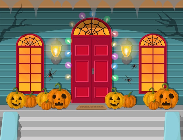 夜のハロウィーンのドアと窓のイラスト。休日の装飾。Premiumベクトル素材。