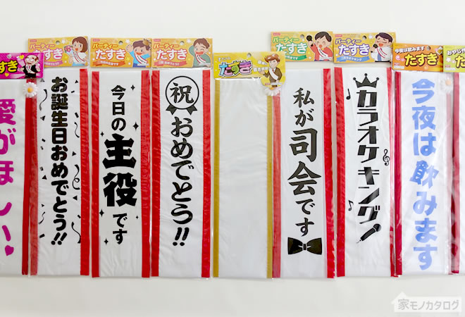 100均ダイソーの無地たすき・文字入りタスキの商品一覧。主役や誕生日、司会用も販売。