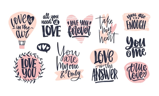 エレガントな筆記体フォントで手書きされたスタイリッシュなバレンタインデーのレタリングのコレクション。ロマンチックなフレーズ、白い背景で隔離のピンクのハートで飾られたスローガン。手描きのベクトル図Premiumベクトル素材。