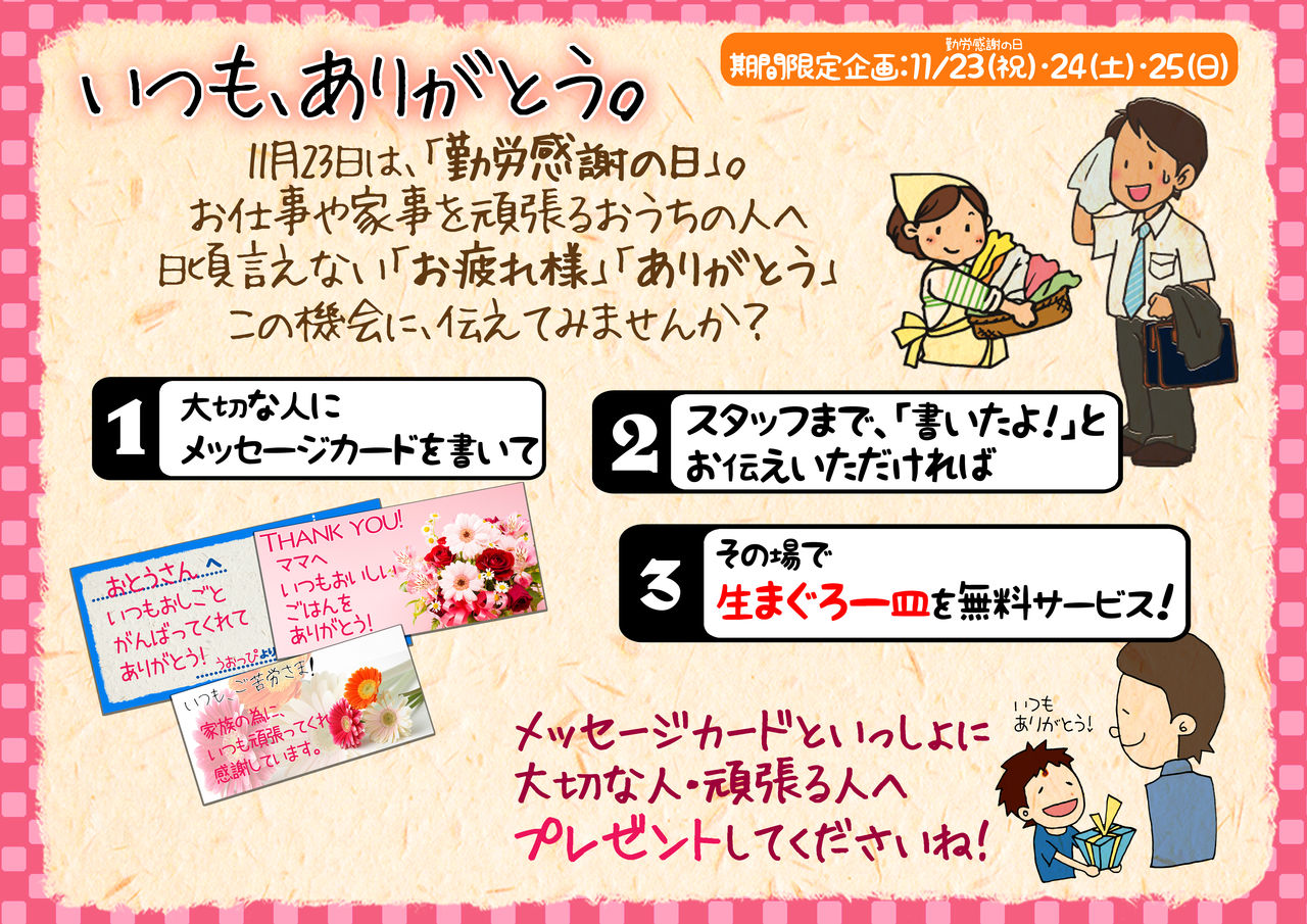 勤労感謝の日 , 本日11月23日は勤労感謝の日です!, 普段はなかなか言えない「ありがとう❤️」の気持ち ,お世話になっているあの人へプレゼント🎁も良いですが、肩揉みやマッサージ、料理を振る舞ったりしても喜んでもらえるかもしれませんね😊💡,いつもは照れくさくて言えない感謝の気持ちを今日は「ありがとう」を伝えてみてませんか?,。