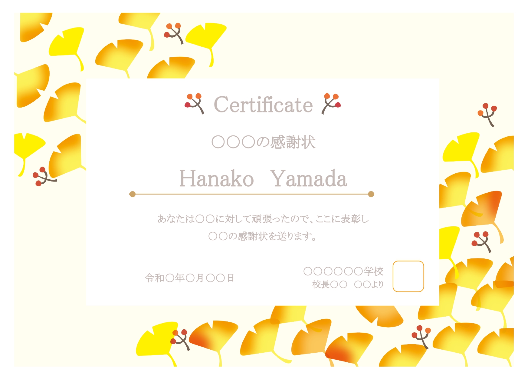 勤労感謝の日、敬老の日に贈る賞状におすすめ!イチョウ柄のフレームデザイン・かわいい感謝状 イラストボックス「プレミアム」テンプレート。