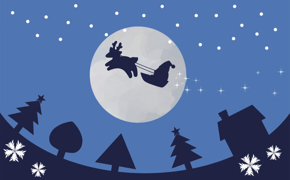 フリーイラスト街並みと満月とサンタのシルエットの青色のクリスマス背景パブリックドメインQ:著作権フリー画像素材集。
