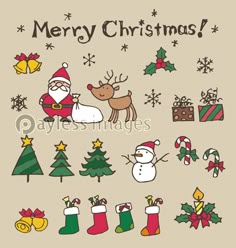 手描き落書きレトロな色でメリー クリスマスの言葉を手書きしてグリーティング カード クリスマスのセットします。サンタ、ホリー、ツリー、鹿、プレゼント、雪だるま、星します。のイラスト素材・ベクターImage 65798060。