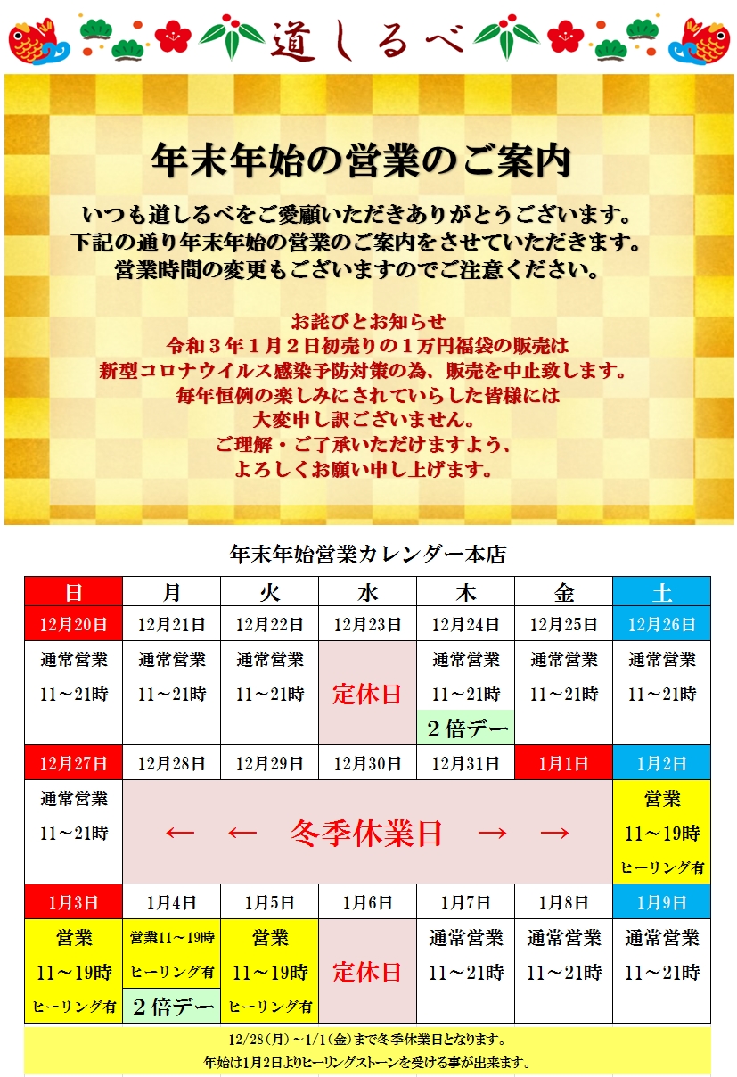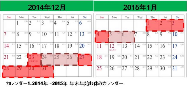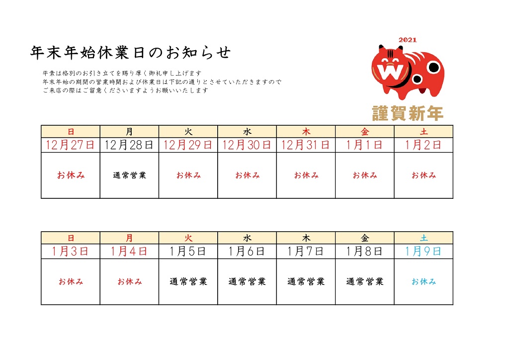 年末年始の営業カレンダ。