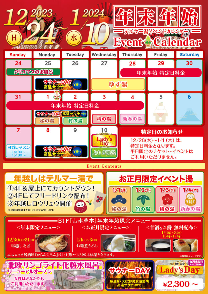 Check! 年末年始イベントカレンダーテルマー湯 新宿店。