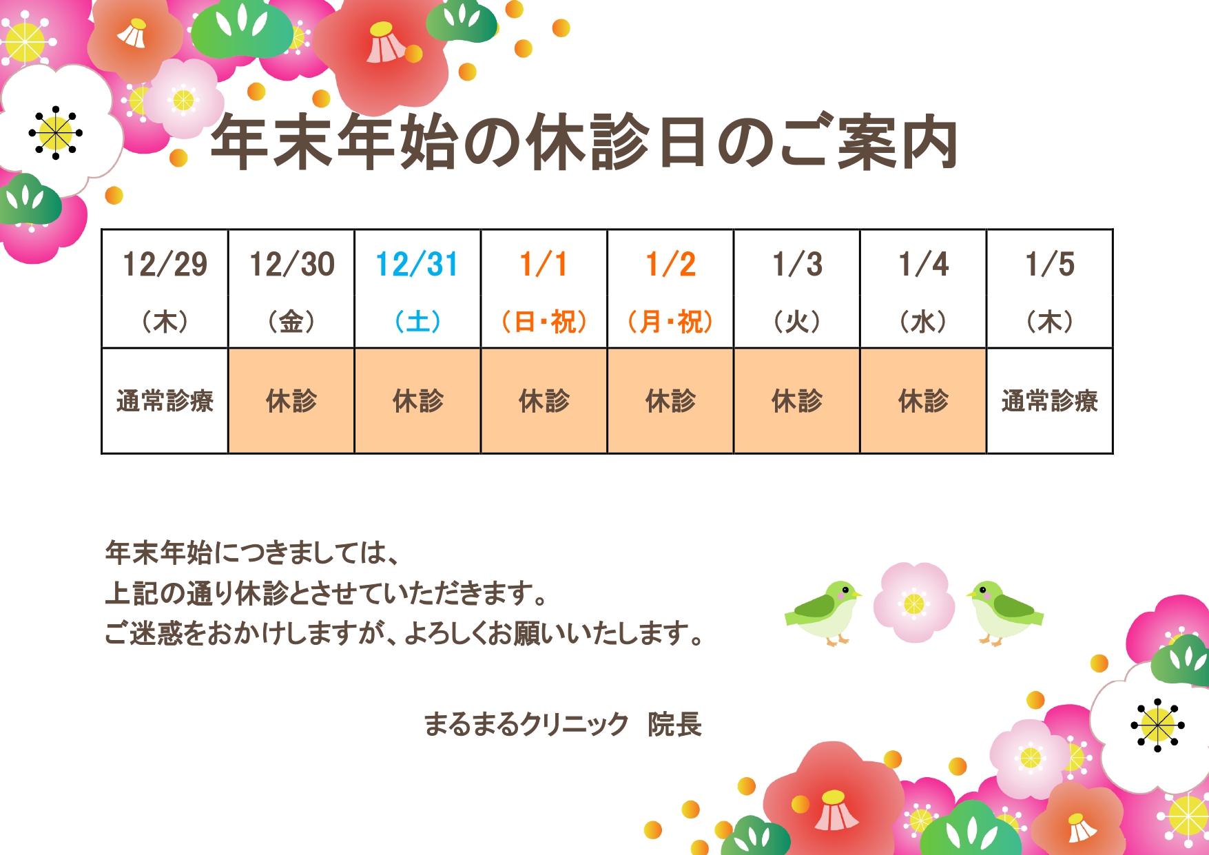 年末年始の休診日・診療日のお知らせ、張り紙のテンプレート素材・カレンダー形式で見やすい横 イラストボックス「プレミアム」テンプレート。