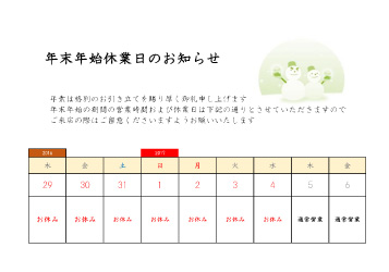 年末年始のご挨拶・お知らせ案内の張り紙テンプレート、カレンダー形式でポスターやPOPにも イラストボックス「プレミアム」テンプレート。