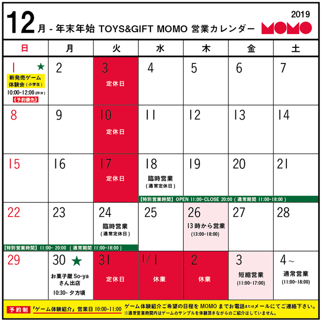 2019年12月-年末年始の営業カレンダー – TOYS&GIFTS MOMO。