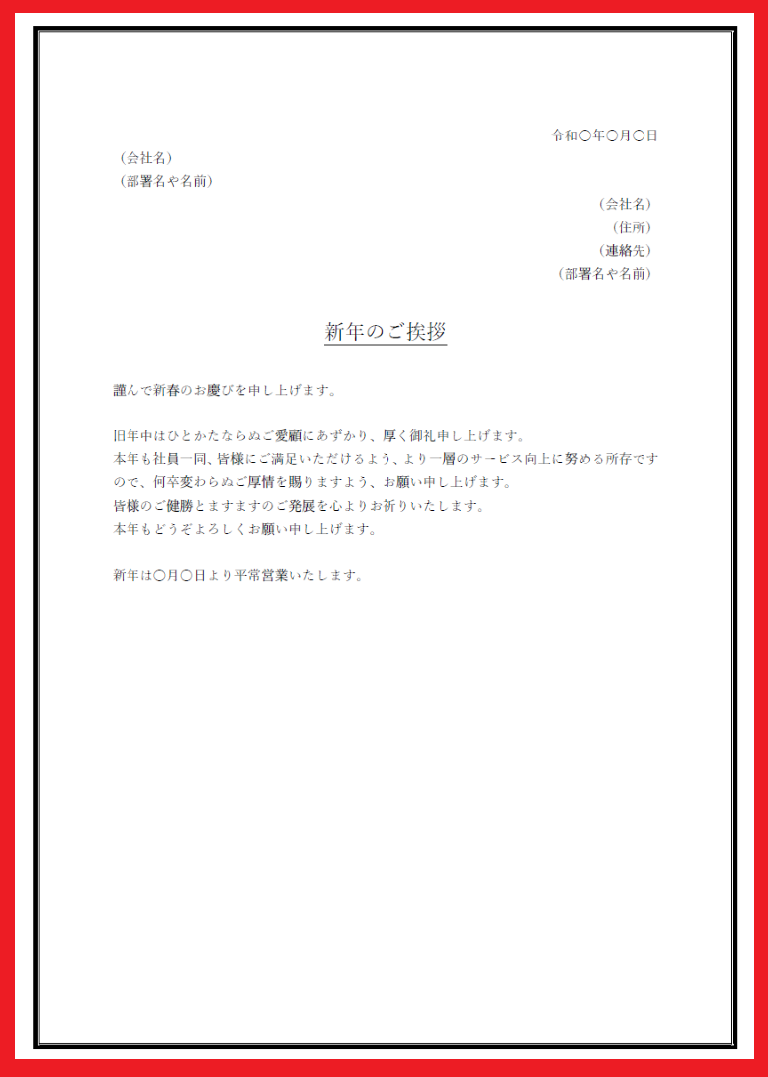 年始のご挨拶状 挨拶文・あいさつ文文例・例文 テンプレート ビジネス 01 A4サイズのビジネス文書タイプワード Word-文書テンプレートの無料ダウンロード。