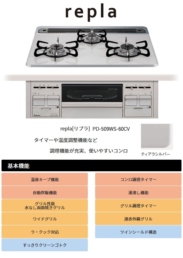 ユアサプライムス.comパロマ ビルトインコンロ リプラ 60cm ティアラシルバー PD-509WS-60CV 3口コンロハイパーガラスコートトップ 水なし両面焼グリル 左右強火力 温度調整機能 都市ガス LPガス プロパンガス 日本製の通販。