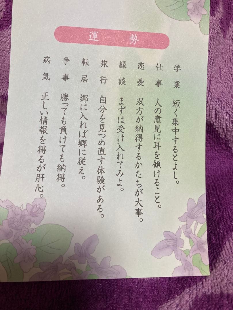 寒川神社さんのおみくじ 「大吉」頂戴しました。 ありがとうございます。 倖せを呼ぶ色は「紫」 今年は紫色を意識します。 調和の美にやどる幸せ周囲の協力に恵まれ なにごとも 順調に進む。 わがままや独断を控え 身近な人たちへの 思いやりを忘れなければ 大きく開運。