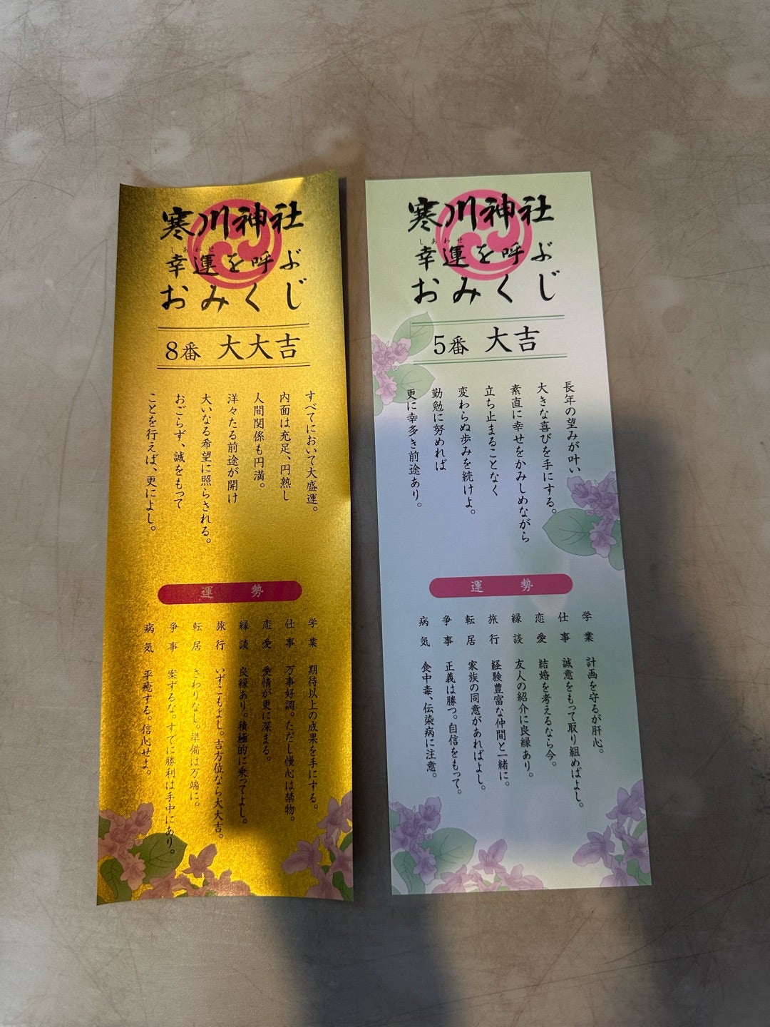 今年は寒川神社へ⛩️おみくじ旦那さんと息子は大吉✨去年旦那さん凶で胆石の手術や仕事が大変だったので今年は大吉で良かった😆息子は2年連続大吉✨本当持ってるわ🤣私は中吉で娘は吉😄中吉書いてあることがなんだか当たっててびっくり‼️寒川神社パワースポット。