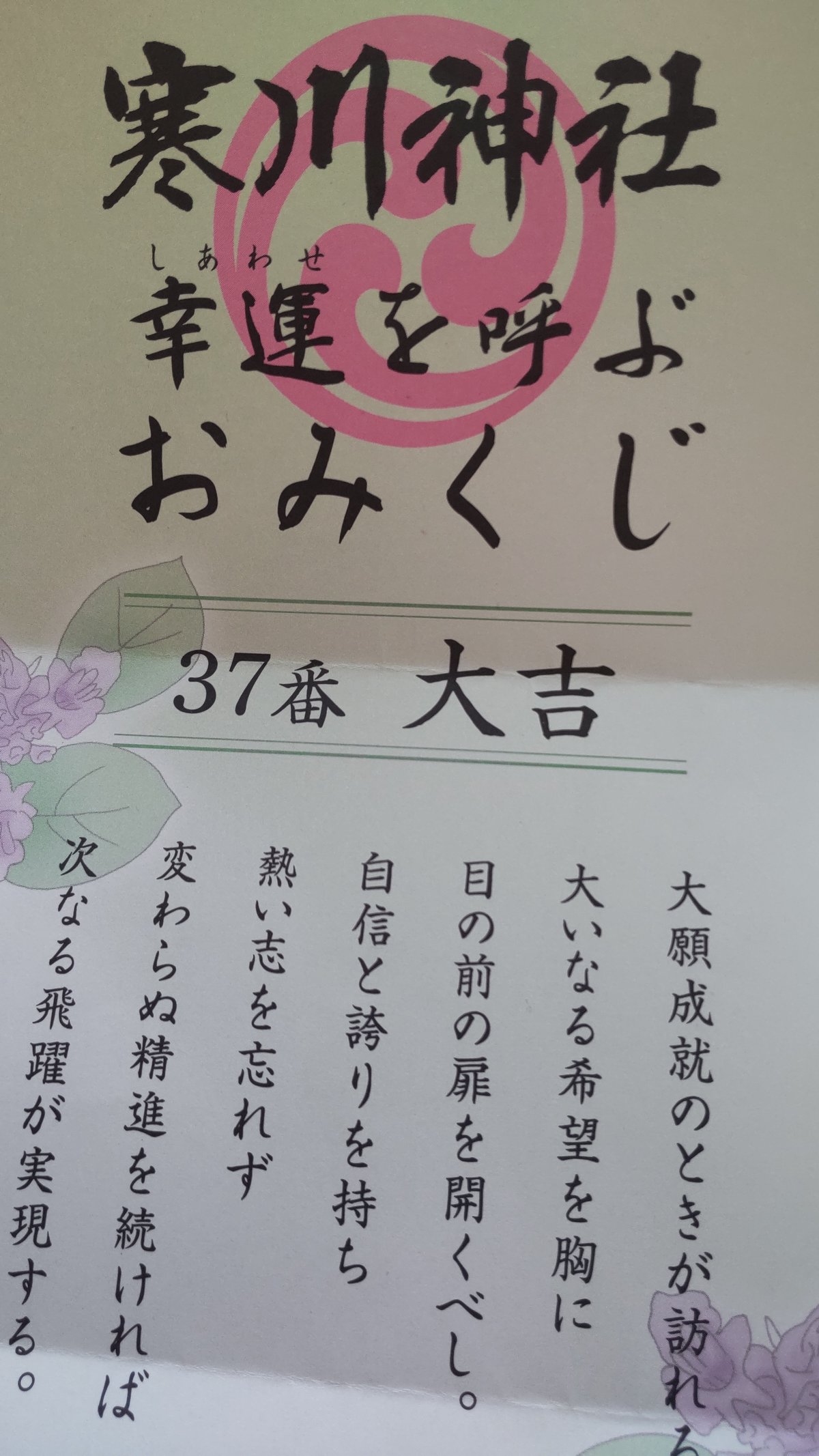 プーちん OORer on X: "運気上昇中です。家族の健康に感謝し、筋トレをコツコツ頑張ります。 寒川神社のおみくじで、大大吉いただきました。^_^https:t.co RbTEWTyMhZ"X。