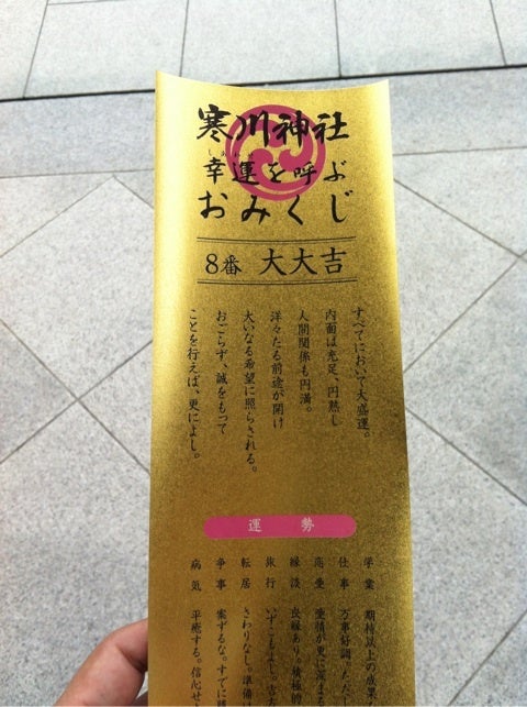 ura_rakuraku_3581271 on X: "スタッフの知り合いの方が寒川神社にて秋分の日と春分の日にしか引けないおみくじで大大吉を引いたそうです!その確率0.00004だそうで ゜ロ゜縁起がいいので、写メで頂きました *^-^皆様にも御利益がありますようにノ^ω^ ノhttps:t。