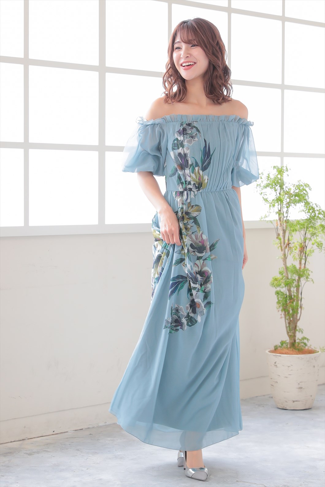 リゾートウエディングやお呼ばれにも ティアードフリルのオフショルがかわいいロング丈スリットワンピース ドレス。