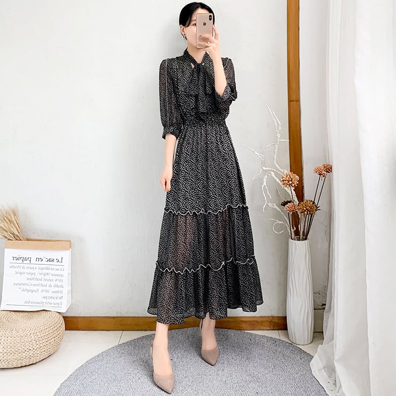 リボンがおしゃれなアクセント☆ティアードスカートドレス 五分袖 韓国 パーティードレス お呼ばれワンピース 春夏 マキシワンピース リゾートワンピース花柄 シフォン 韓国 ファッション レディース パーティー ブライダル カラードレス お取り寄せ お呼ばれ コーデ。