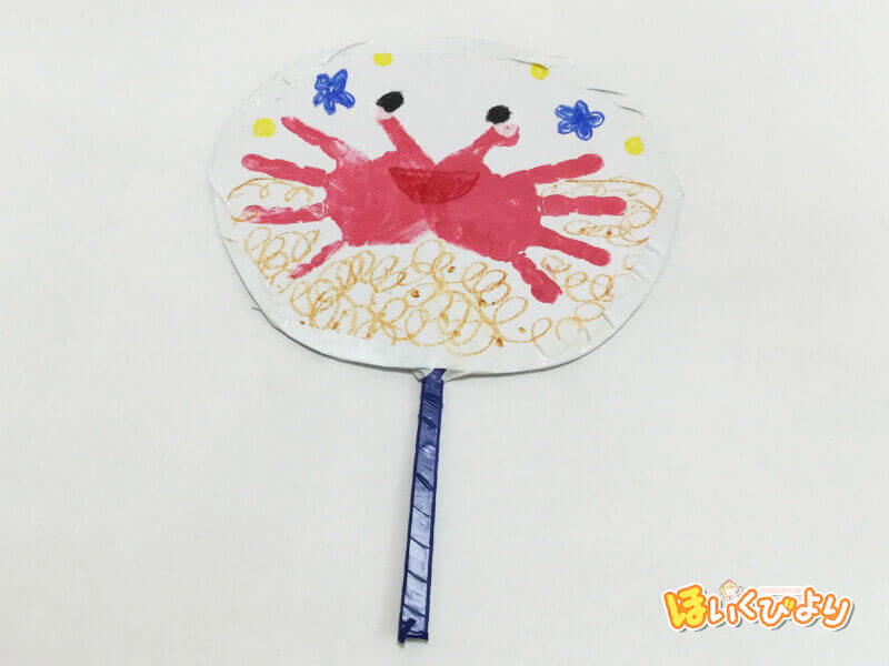 うちわ製作もうすぐあちらこちらで夏祭りが始まりますね♫ 夏祭りに向けて、 子どもたちとペインティング遊びや 手形取りをして、うちわを作りました‼️子ども達の手形はカニさんに変身しましたよ🤗 よーく見るとお目目がいろんなところに😃 子どもらしくって、みんな。