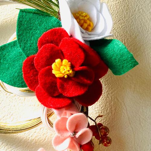 フェルトで作る正月飾り お正月リース DIY Japanese style New year decorationFelt Camellia。