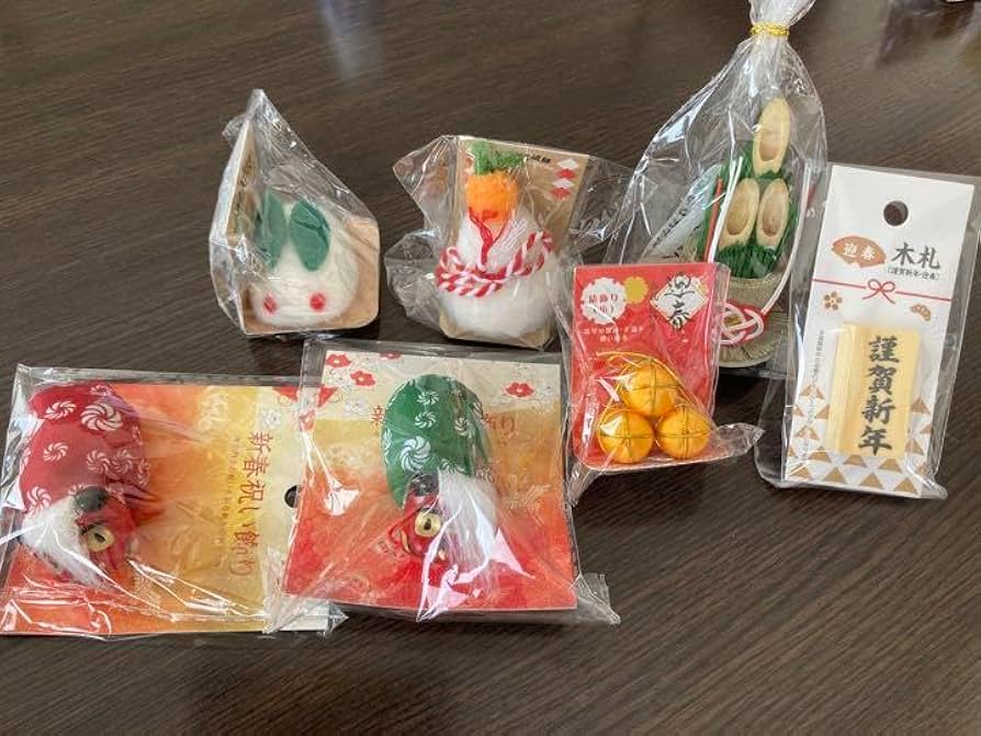 Amazonセリア 正月祝い 飾り 7点 フェルト雪ウサギ フェルト鏡餅 俵飾り小 木札 ミニ門松 ミニ獅子舞正月飾りおもちゃ。