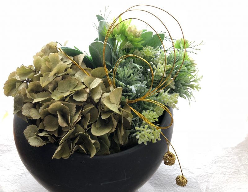 水引で作るお正月クーゲル プリザーブド&アーティフィシャルフラワーアレンジはかた大学。