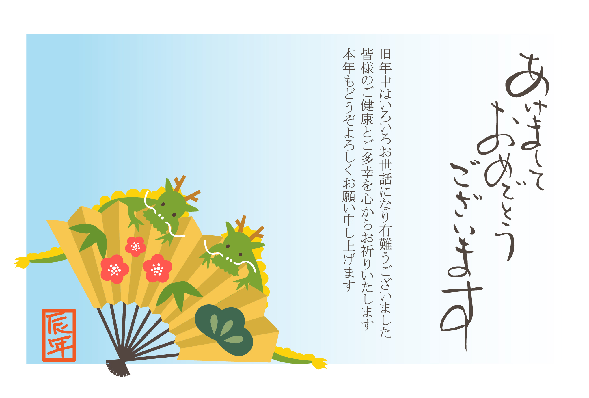 年賀ハガキ2024年辰年デザイン・辰と扇子のお正月らしいかわいいイラスト・縦書きにおすす イラストボックス「プレミアム」テンプレート。