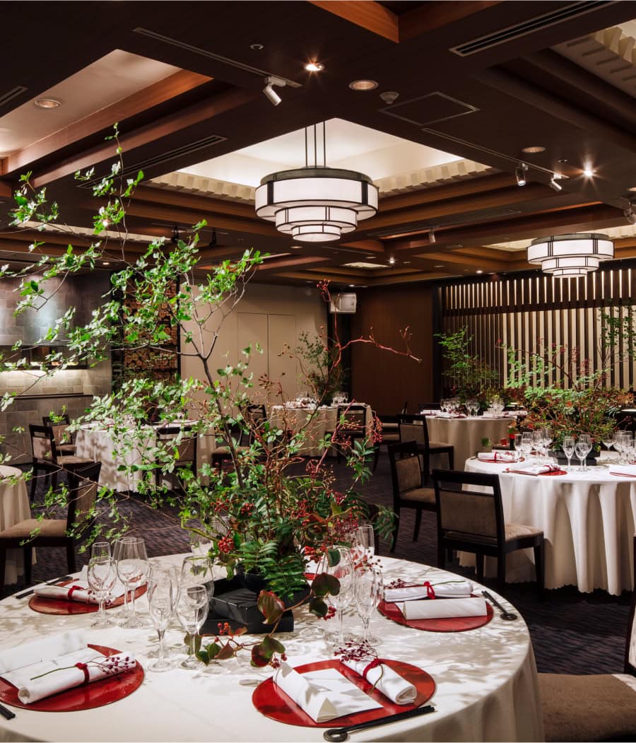八芳園の日本庭園の奥に建つ別館「白鳳館」。 日本の伝統文化と職人技の粋を集めた、数寄屋造りの邸宅です。羽ばたく鳳凰をイメージして設えた一棟貸し切りの会場。 ご婚礼では、前庭に面した濡れ縁からの入場など、雅やかな演出も魅力。 日本の美と庭園の四季を間近に。