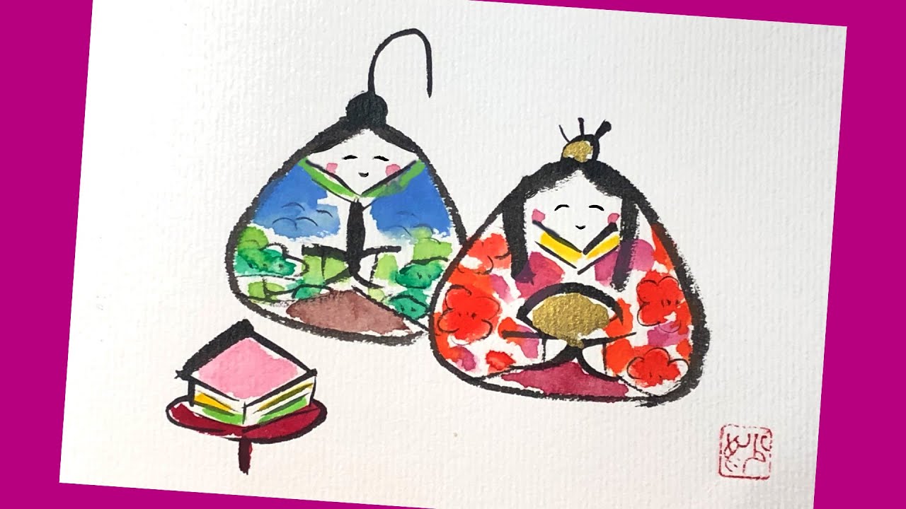 絵手紙妙華 簡単4分:ひな祭ri『雛人形』の絵手紙2月・3月春の絵手紙・ハガキ絵・一筆画・墨絵 sumi-e のおひなさまと桃の花のかわいいイラストの描き方。